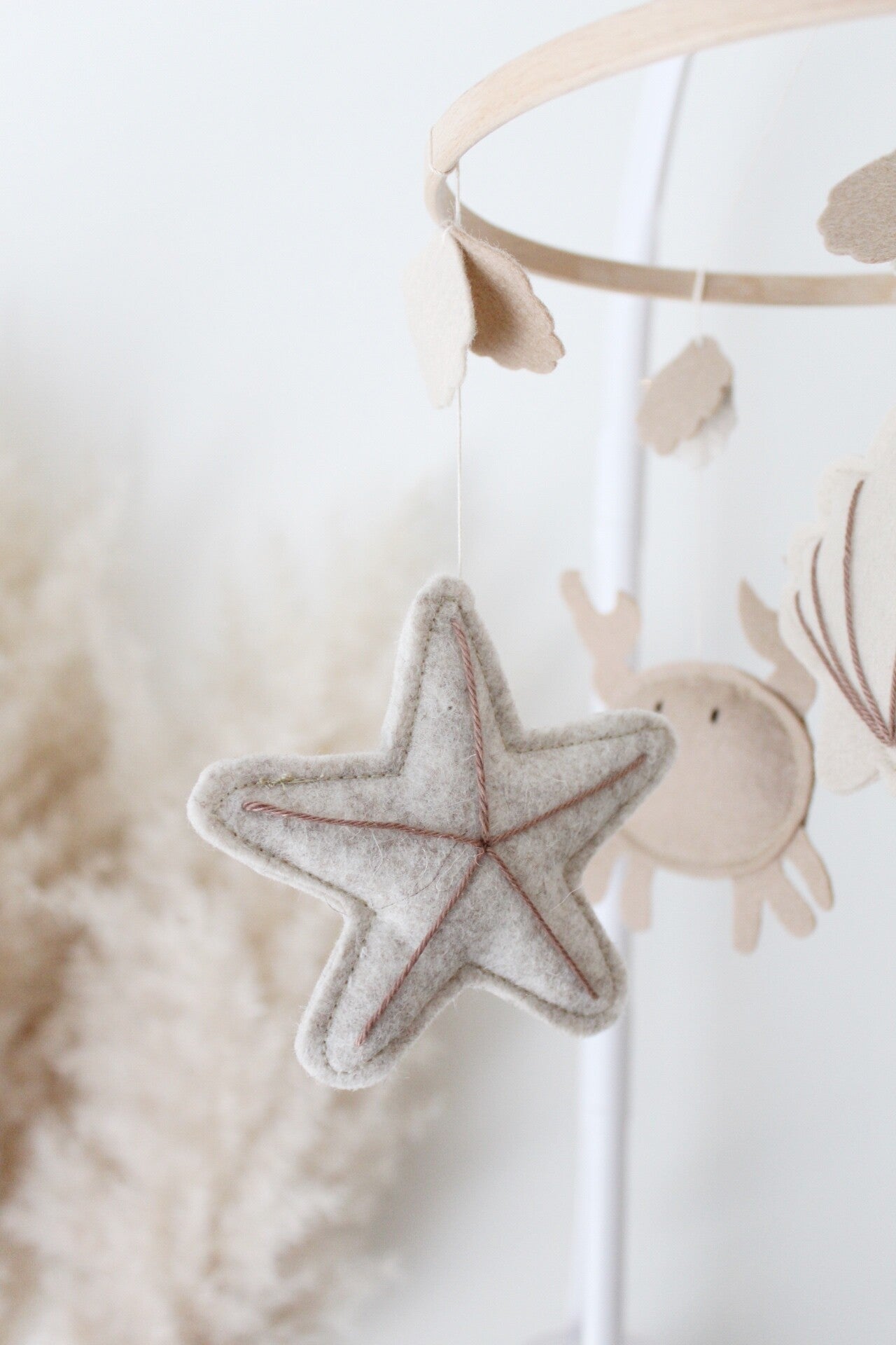 Laat je baby dromen van zon, zee en strand met deze betoverende natuurlijke babymobiel, versierd met schattige stranddieren zoals een krab, zeester, vissen en schelpen. Deze mobiel brengt de rustige sfeer van het strand naar de babykamer, perfect voor echte zee liefhebbers!