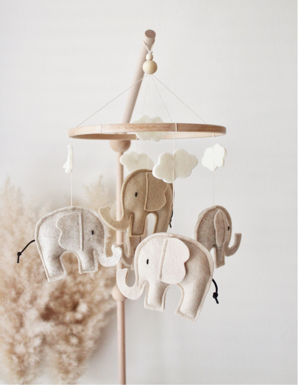 Een lieve gezellige groep olifantjes, dansen in het rond. Ze geven een gevoel van rust en harmonie in de babykamer of boven de box. De zachte natuurlijke tinten geven de olifantjes een mooie en warme uitstraling, waardoor deze mobiel ideaal is voor een neutrale decoratie.